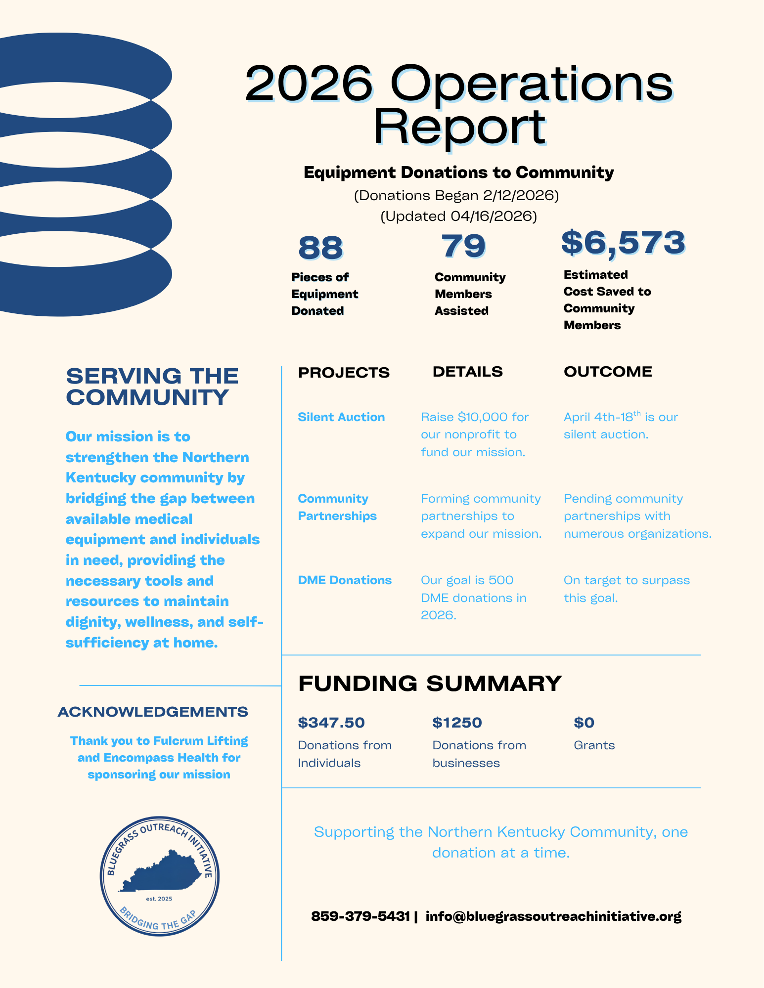 At Bluegrass Outreach Initiative, our mission is to strengthen the Northern Kentucky community by bridging the gap between available medical equipment and individuals in need, providing the necessary tools and resources to maintain dignity, wellness, and self-sufficiency at home.